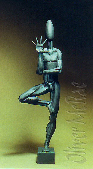 The Watcher pays tribute to the faceless figures of the prehistoric Cyclades, whose senses turned to inner vistas: seeing visions and dreaming dreams. He addresses the external world with the universal gesture of affirmation - the open hand, while perching like stork and Australian aborigine on one leg - poised forever in the zen tranquility of the immediate and eternal, ongoing, here now.